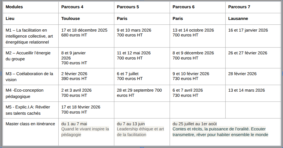 Le coeur de cette formation réside dans l’apprentissage d’une posture d’accompagnement des groupes pour les vitaliser et prendre soin, car, apprendre et vivre sont pour moi synonymes.